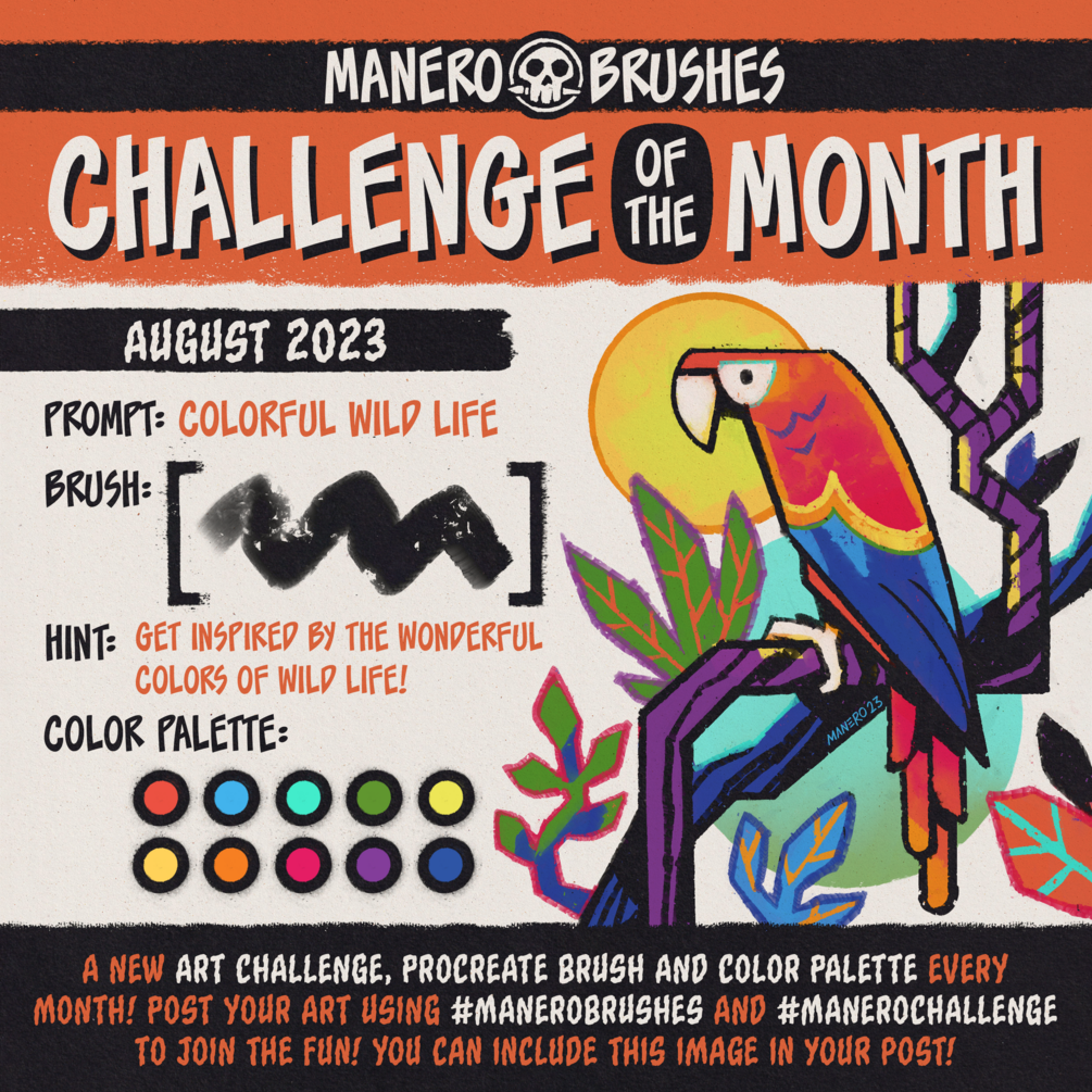 What's this? I'm giving you a new art prompt, FREE Procreate brush and color palette every month! The challenge is to draw or paint something based on the given art prompt using just the brush and color palette provided. Join the fun by posting your art on social media using the hashtags #MANEROBRUSHES and #MANEROCHALLENGE! (And feel free to include the official image for the challenge in your post if you want!)