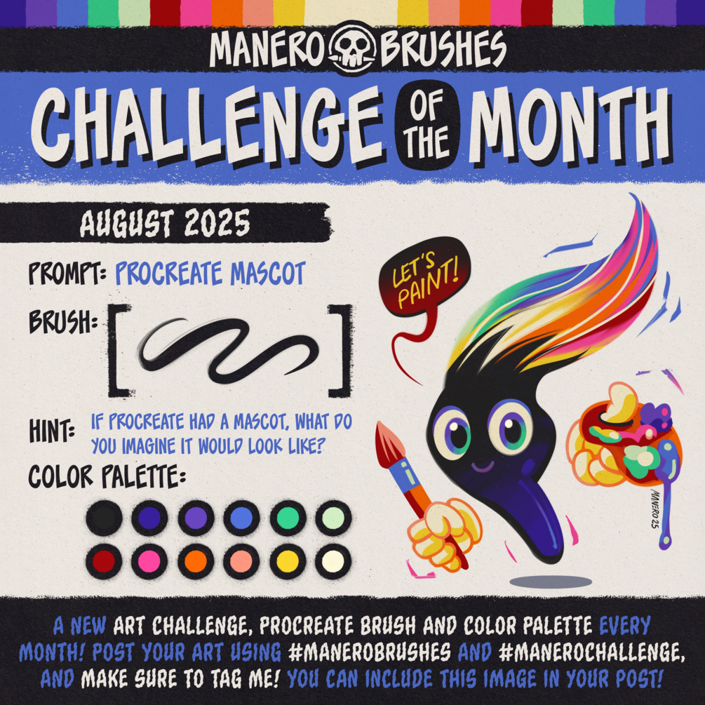 What's this? I'm giving you a new art prompt, FREE Procreate brush and color palette every month! The challenge is to draw or paint something based on the given art prompt using just the brush and color palette provided. Join the fun by posting your art on social media using the hashtags #MANEROBRUSHES and #MANEROCHALLENGE! Also don't forget to tag me so I can see your creations! (And feel free to include the official image for the challenge in your post).