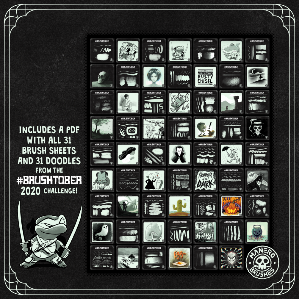 A 62-page PDF with all 31 brush sheets and 31 #Brushtober doodles