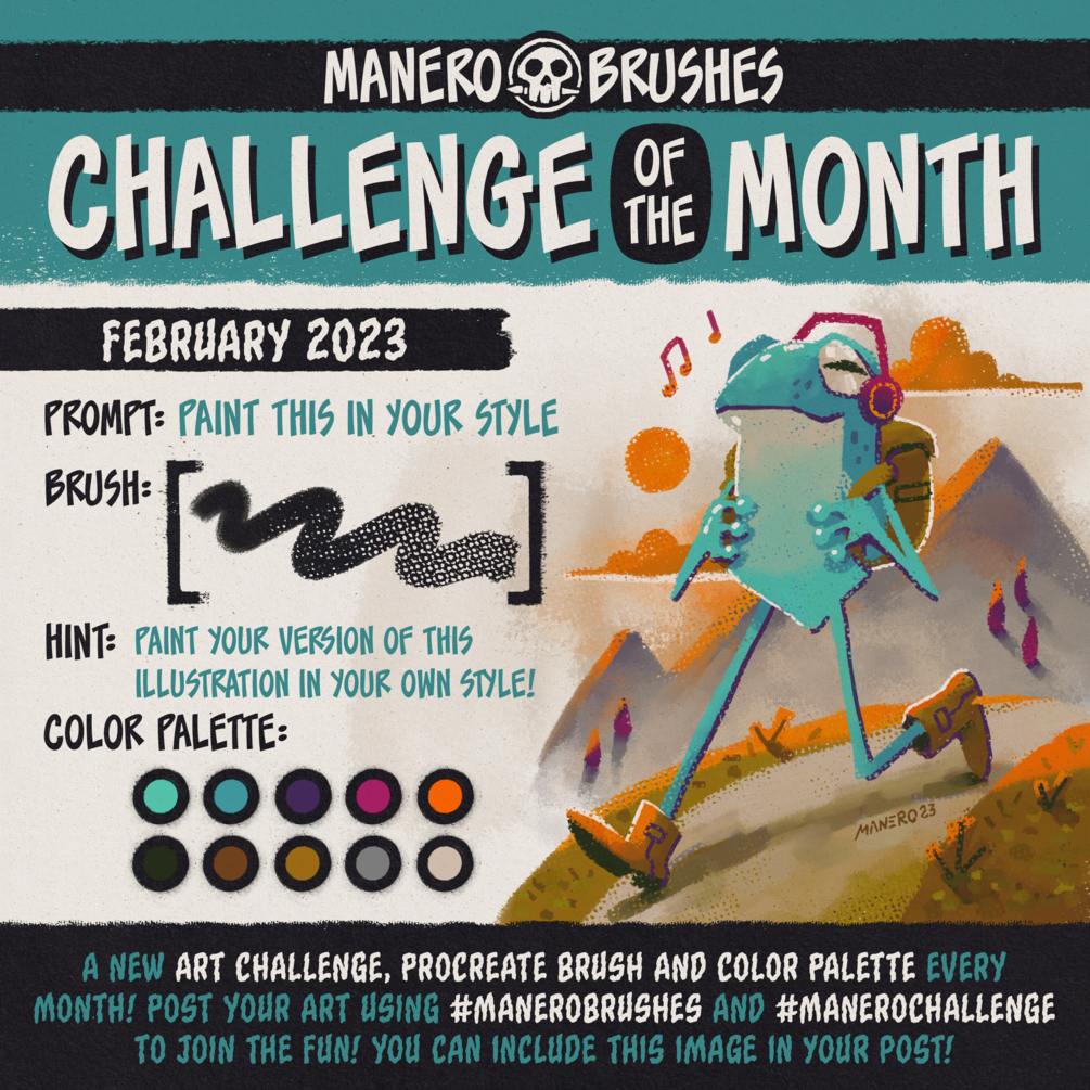 What's this? I'm giving you a new art prompt, FREE Procreate brush and color palette every month! The challenge is to draw or paint something based on the given art prompt using just the brush and color palette provided. Join the fun by posting your art on social media using the hashtags #MANEROBRUSHES and #MANEROCHALLENGE! (And feel free to include the official image for the challenge in your post if you want!)