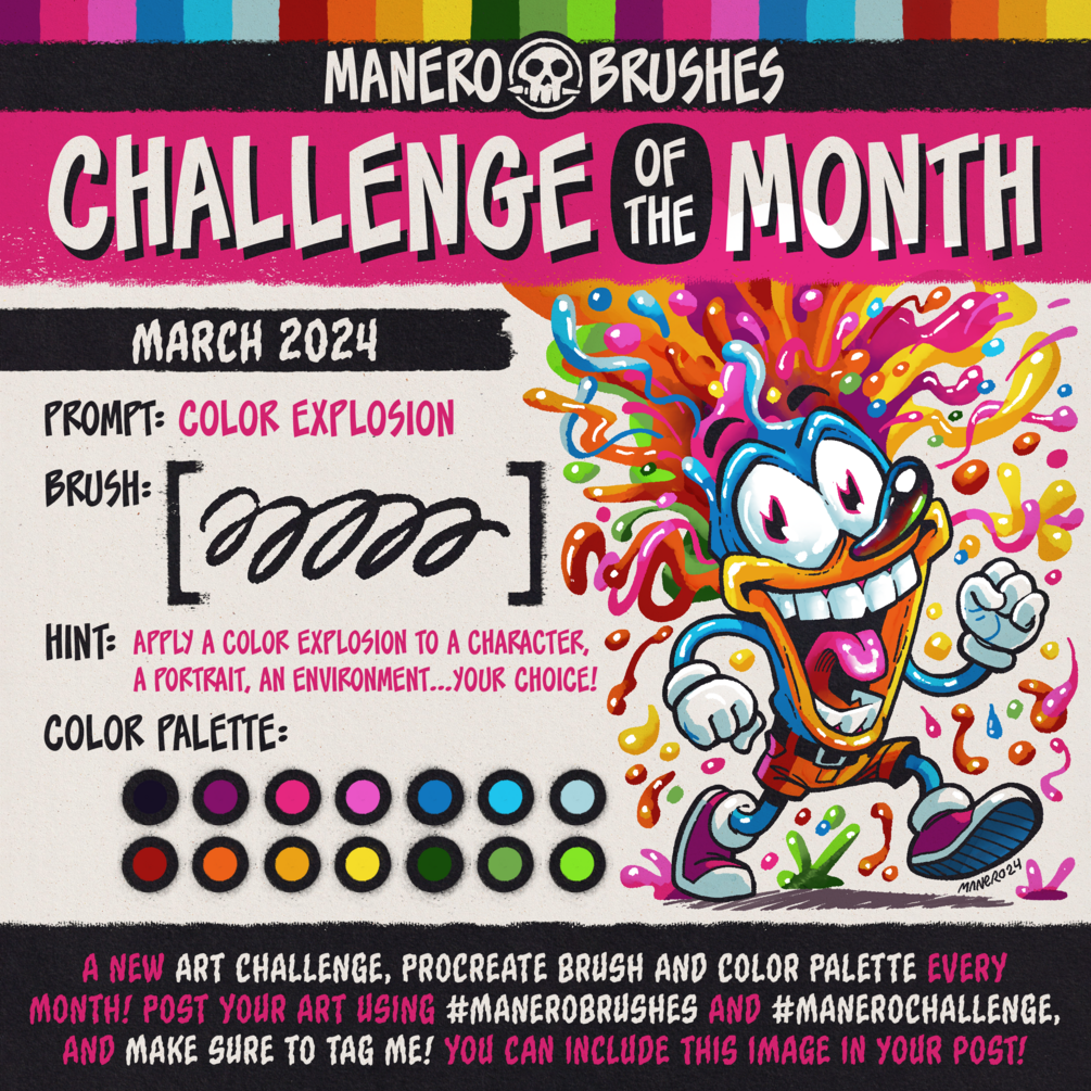What's this? I'm giving you a new art prompt, FREE Procreate brush and color palette every month! The challenge is to draw or paint something based on the given art prompt using just the brush and color palette provided. Join the fun by posting your art on social media using the hashtags #MANEROBRUSHES and #MANEROCHALLENGE! Also don't forget to tag me so I can see your creations! (And feel free to include the official image for the challenge in your post).